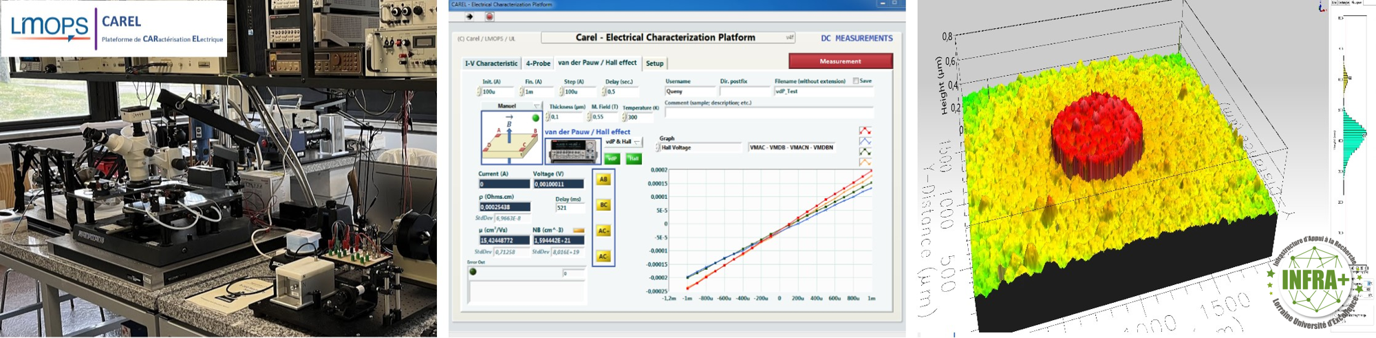 Afin de pouvoir étudier ces propriétés, le LMOPS a développé des bancs de mesure destinés à la caractérisation électrique des matériaux (principalement semi-conducteurs) regroupés au sein d’une plateforme technologique : la plateforme CAREL. Cette plateforme de caractérisation électrique (CAREL) a été conçue et mise en œuvre pour permettre l’étude et l’optimisation de matériaux et dispositifs à semi-conducteurs notamment, grâce à des techniques fiables et précises suivants une méthodologie cohérente. Les caractérisations sont effectuées sur une couche ou un composant, c’est-à-dire après une étape de traitement et de dépôt des contacts métalliques.